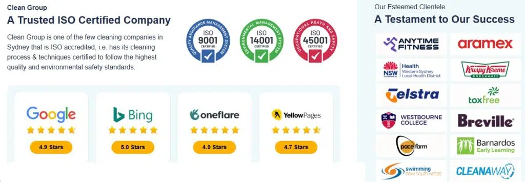 In the commercial cleaning industry, an ISO certification is a testament to a company’s global standards in quality and health. Only about 5% of cleaning companies in Sydney hold this prestigious certification. Clean Group is proud to be one of them.